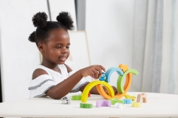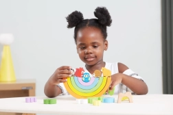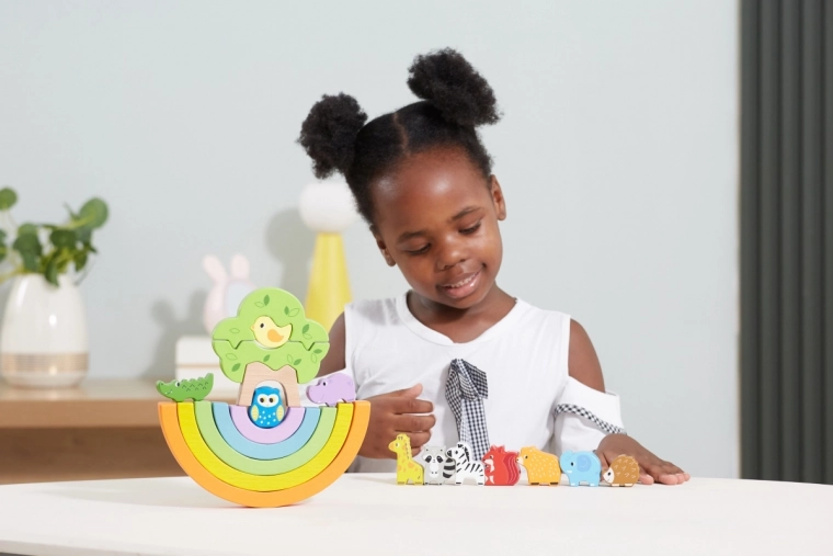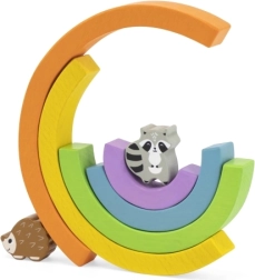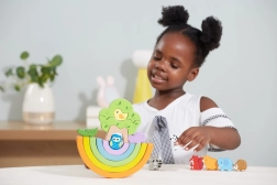 De fem regnbuebuer hjælper børn med at genkende farver og deres rækkefølge, mens de øver tålmodighed og balance ved at afbalancere delene.