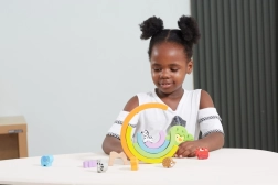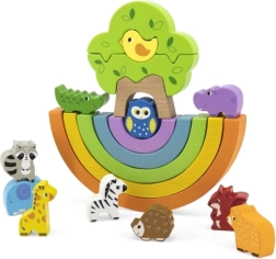 Dette Montessori-byggesæt kombinerer glæden ved at stable regnbuen med fantasifuld leg med søde dyr. Børn kan lægge farvede buer i lag, skabe tunneler og broer, bygge omgivelser til dyrene og udforske, hvordan balancering og stabilitet fungerer. Legen udvikler naturligt finmotorik, sansemotorik og kreativitet.