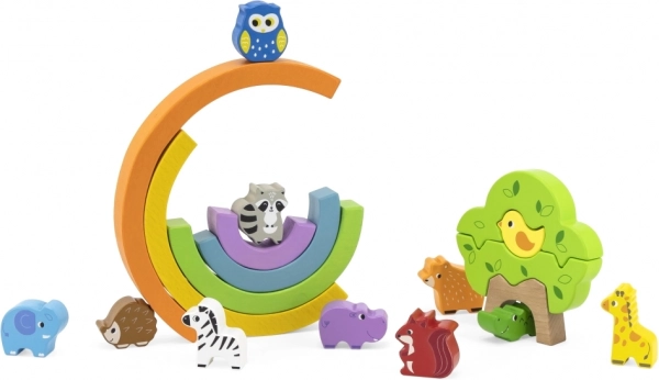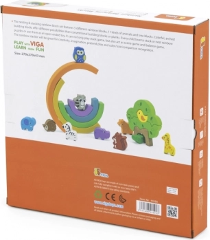 En farverig træregnbue med 11 dyr og et træ fra Viga, der tilbyder uendelige muligheder for kreativ leg. Børn træner balance og koordination, bygger huse og forhindringer og lærer farver og rækkefølge. De glatte dele af kvalitets træ er sikre uden skarpe kanter og lakeret med giftfri farver.