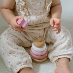 Sikre, glat-slebne dele ligger godt i små hænder, og trækonstruktionen er miljøvenlig og holdbar. Pyramiden er perfekt til de første tårne og giver rolig, meningsfuld skærmfri underholdning.