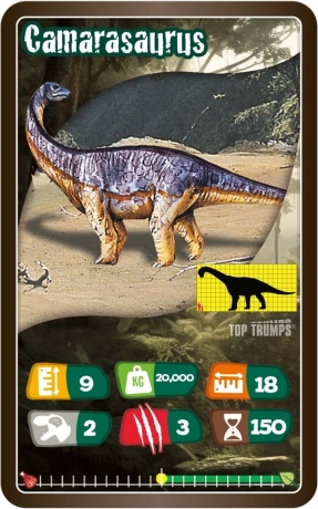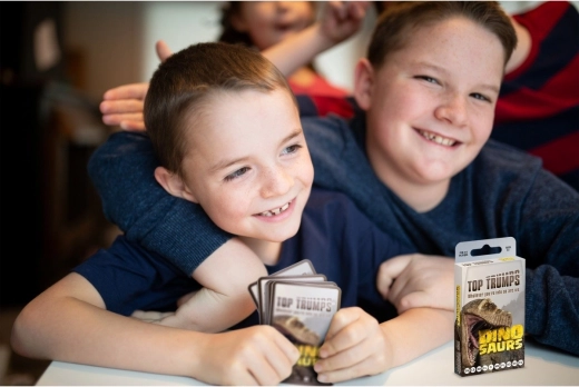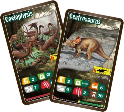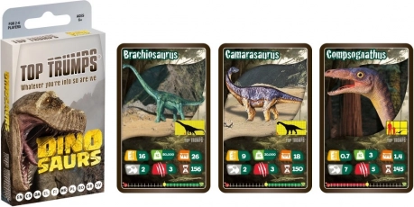 TOP TRUMPS – Dinosaurer byder på spændende sammenligninger af parametre for legendariske forhistoriske dyr. Hvert kort indeholder en fængende illustration og nøglestatistikker, så spillerne klogt kan vælge kategori og overliste modstanderne. Den kompakte tuck box gør det let at tage spillet med – på tur, ferie eller besøg.