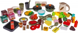 Gryde, pande, bestik, tallerkener, madvarer med velcro, drikkevarer, krydderier, kridttavle og klistermærker – alt til kreativ madlavning.