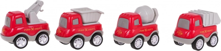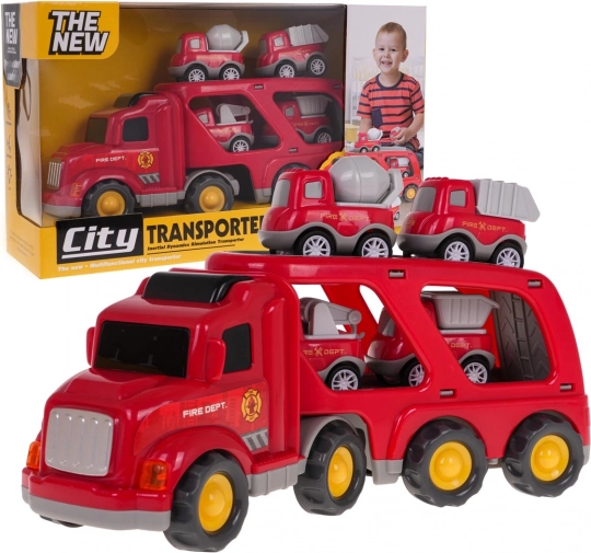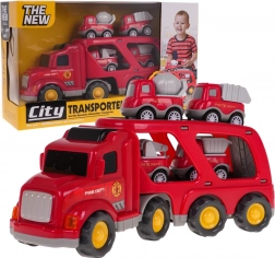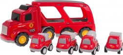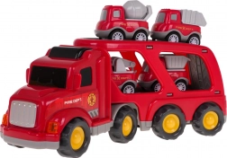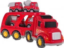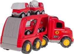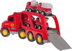 Dette detaljerede sæt af brandkøretøjer giver børn mange timers kreativ underholdning. Den store transportlastbil med aftagelig trailer kan rumme fire mindre arbejdsbiler. Ved tryk på knappen på taget af kabinen tændes forlygterne, og autentiske lyde af start, kørsel og horn afspilles.