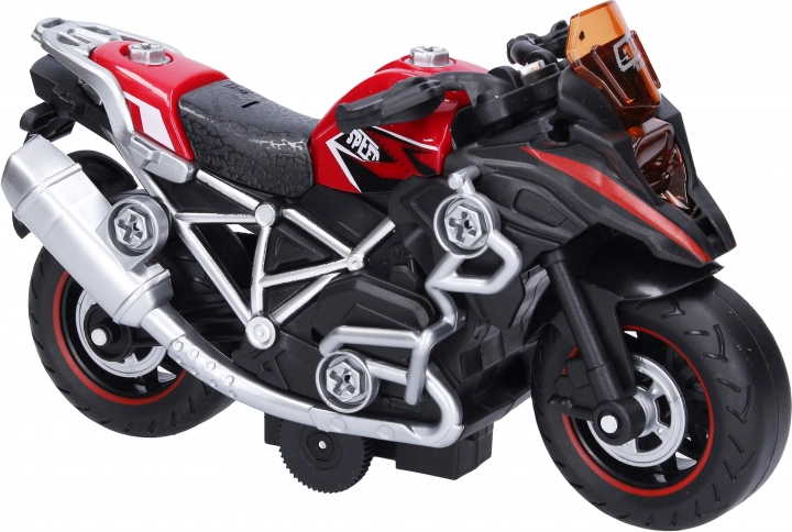 Rød skruemotorcykel med lys- og lydeffekter, mål 20x8,5x12 cm. Indeholder skruetrækker og nøgle.