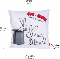 Børnepuden BOB OG BOBEK 30 × 30 cm glæder alle fans af de legendariske kaniner fra hatten. Den bløde mikrovelour er skånsom mod børns hud, det kvalitetsrige print med motivet “træner” bevarer farverne længe, og fyldet af hulfiber er let og formstabilt.