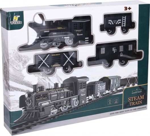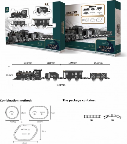 Sættet indeholder et lokomotiv (20 cm), tre vogne (10–15 cm), lige og buede skinner samt en vandbeholder til at skabe en realistisk røg-effekt. Strømforsyning via 4× AA-batterier (medfølger ikke). ON/OFF-kontakten er placeret på lokomotivets venstre side, og vandtanken findes under den sølvfarvede skorsten.