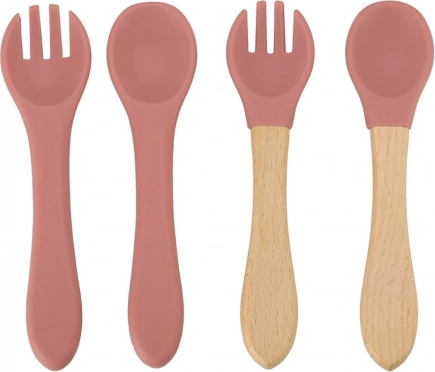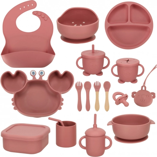 Komplet sæt af silikoneservice til børn i mørk rosa farve indeholder tallerkener, skåle, kopper og bestik. Servicet er lavet af sikker silikone, er let at rengøre og er ideelt til at lære selvstændig spisning.