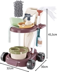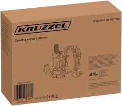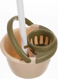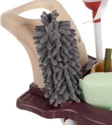Vogn med ergonomisk håndtag - vognen på fire brede hjul, lavet af højkvalitets PP-plast, er designet til let manøvrering. Det ergonomiske brede håndtag gør det nemt for børn at styre vognen selv under leg på farten. På to hylderkan forskellige dele af sættet placeres: spand med si til moppe på nederste hylde og skål, underlag, vrider og sæbeskål på øverste hylde. Takket være særlige åbninger kan den runde støvkost, svamp og moppe placeres i vognen, hvilket giver let adgang til alle redskaber. På siderne af vognen er der to kroge til at hænge mikrofiberkluden.