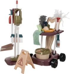 STORT TILBEHØRSSÆT - Sættet er usædvanligt rigt på forskelligt tilbehør, som nøjagtigt efterligner rigtige rengøringsredskaber. Der er moppe med spand og vridersi, mikrofiberstøvkost, svamp, klud, advarselsskilt og diverse rengøringsredskaber - skrubebørste, rengøringssvamp og mikrofiberklud.