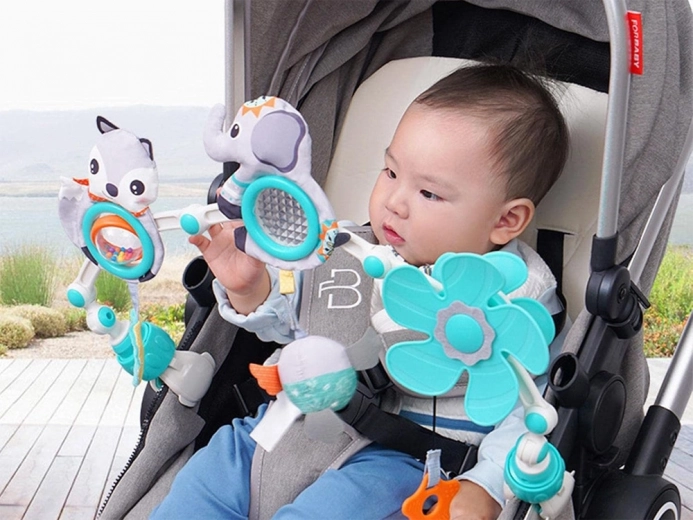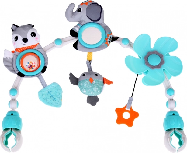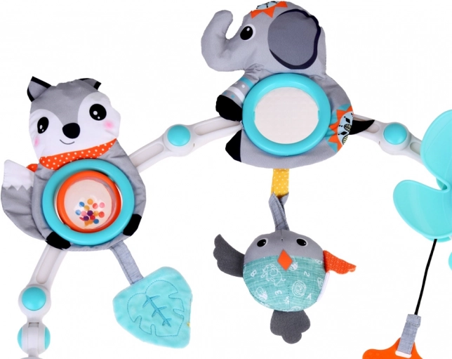 En lille elefant med knitreeffekter og spejl, en fugl som et spændende element for babyer og en blomst-vindmølle, der kan sættes i bevægelse ved at trække i den orange stjerne.