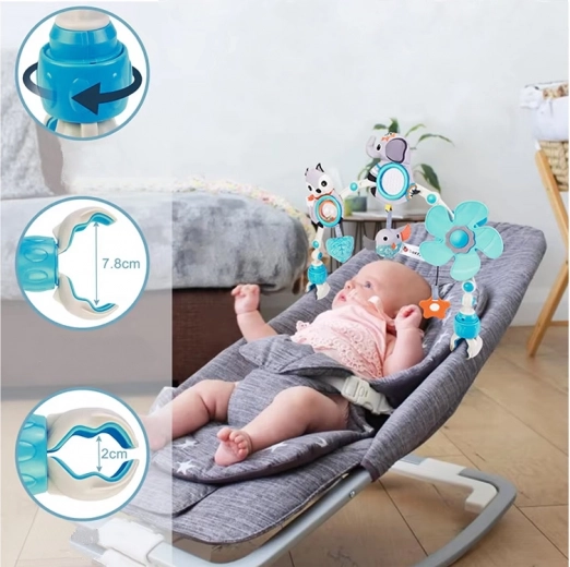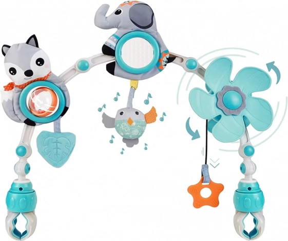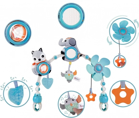 Denne smukke og funktionelle ophængte aktivitetsbøjle er et ideelt tilbehør ikke kun til tremmesengen, men også til barnevognen eller autostolen. Den har farverige og interessante elementer, som fanger barnets opmærksomhed, hjælper med at berolige det og vækker dets nysgerrighed. Den ophængte bøjle indeholder elementer som bidering, lyd- og roterende komponenter. Den har også stærke og fleksible clips, som gør det nemt at montere på forskellige overflader.