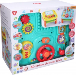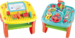 Det dobbeltsiddede aktivitetsbord på 37 cm kombinerer leg og læring i ét. Oversiden med rat, gearstang og rasler udvikler finmotorik og sanser, mens undersiden med magnetisk tegnetavle og klodsebase styrker kreativitet og fantasi.