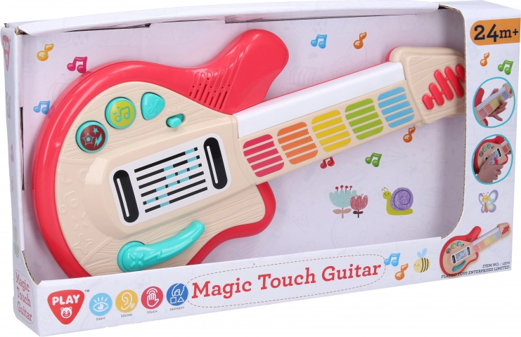Opdag de første musikalske skridt med PLAYGO touch-elektrisk guitar. Takket være berøringssensorer på hals og krop reagerer instrumentet på let berøring og spiller enkelte toner. Lyseffekter forstærker oplevelsen, mens overskuelige knapper gør det muligt at skifte melodier, forvrængning og lydstyrke.