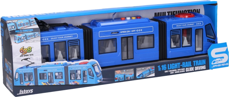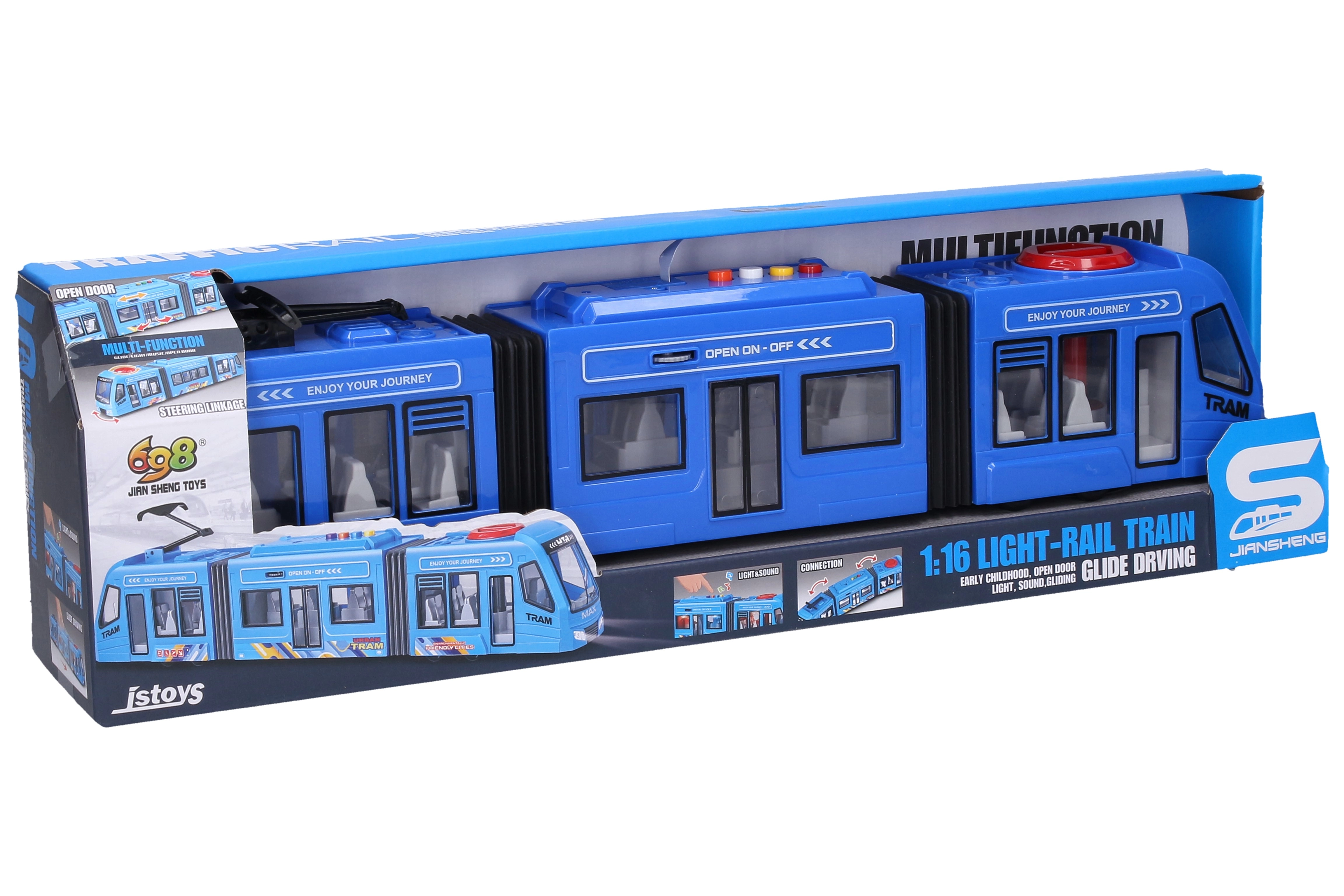 Realistisk sporvogn for små og store fans af offentlig transport. Tilbyder lys- og lydeffekter, friløb og nem betjening via knapper på taget. Takket være åbning af de midterste døre og drejning af forhjulene er legen endnu sjovere. Batterier 3× AG13 er inkluderet i pakken, så du kan køre afsted med det samme.
