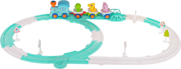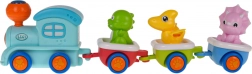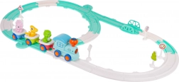 Denne interaktive togbane med dinosaurer bringer masser af glæde til børneværelset. Lokomotivet på 2× AA-batterier lyser op og spiller melodier, mens toget suser afsted på de farverige skinner. Hver af de 3 vogne kan let afkobles, og dinosaurfigurerne kan tages ud til selvstændig leg.