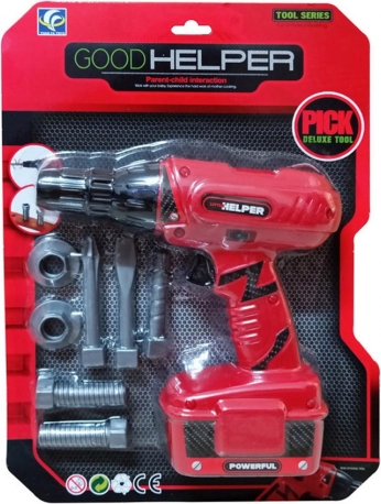 Dette sæt indeholder en realistisk akku boremaskine, der ikke kun ligner den ægte vare, men også roterer og udsender autentiske borelyde, når der trykkes på knappen. Den indeholder udskiftelige bor og skruer, hvilket øger legekens realisme.