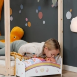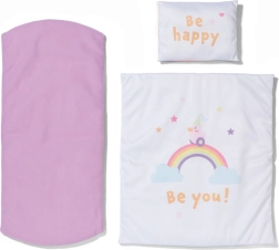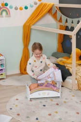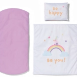 En blød pude, dyne og underlag med glade tekster og regnbuemotiver gør det muligt at skifte udseende på sengen efter humør.