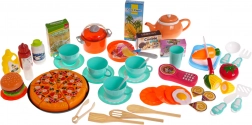 Ovn, køleskab, opvaskemaskine, kaffemaskine, telefon og dusinvis af tilbehør: gryder, pande, redskaber, drikkevarer, madvarer med velcro samt opskriftskort. Alt til et komplet legekøkken.
