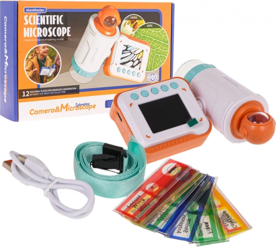 Teleskop med kamera og mikroskop til børn fra 3 år. Nem at bruge, forstørrelse op til 1000x, 12 prøver.