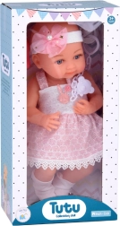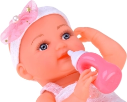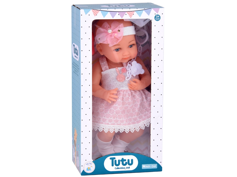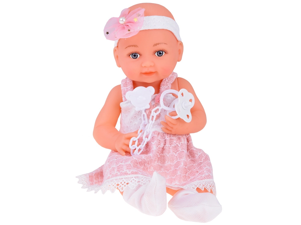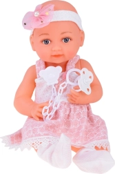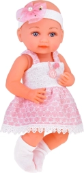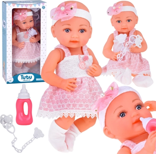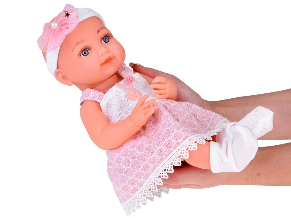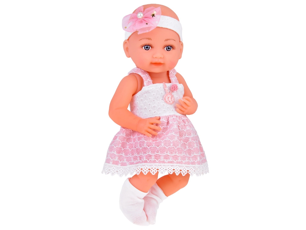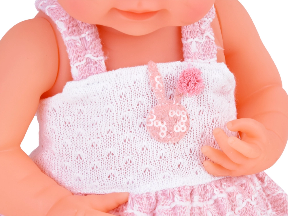 Dukkens venlige ansigt indbyder til leg. Babyen er klædt i en sød hvid- og lyserød kjole, pyntet med en pompon og blonde. Selvom babyen ikke har hår, prydes hendes hoved af et tylbånd med sløjfe og perler. På fødderne har hun hvide sokker.