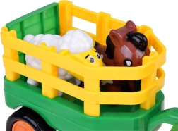 Den gul‑grønne anhænger kan åbnes for nem lastning og aflæsning. Børn kan transportere både hesten og fåret og skabe deres egne bondegårdshistorier.