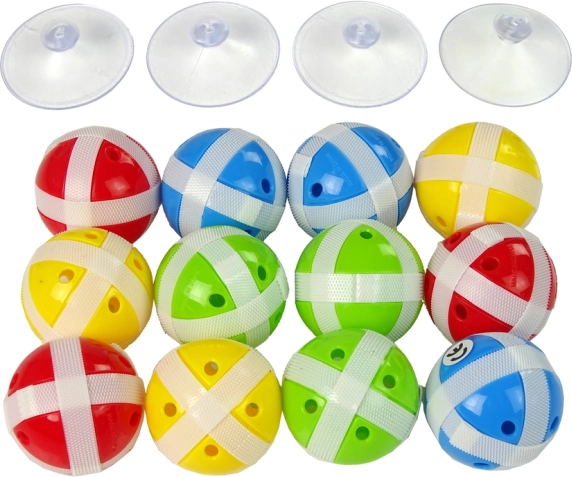 12 lette bolde i 4 farver fæstner sig sikkert til målskiven og er skånsomme mod både møbler og børnehænder.