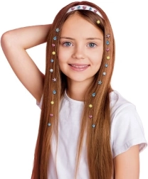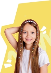 Pakkens indhold: applikator, 80 stk. glimtende sten, tilbehør. Anbefales til børn fra 5 år med en voksens opsyn ved brug i hår.