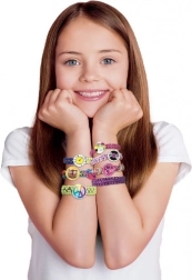 Takket være det rige indhold med garn, forbindelsesknapper og klistermærker kan du lave en hel kollektion af farverige armbånd.