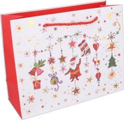 Denne julegavepose gør gaveindpakning nem og giver et festligt udtryk. Den mellemstore størrelse M er alsidig til de mest almindelige gaver, og det kvalitetsmateriale sikrer, at alt forbliver sikkert på plads.