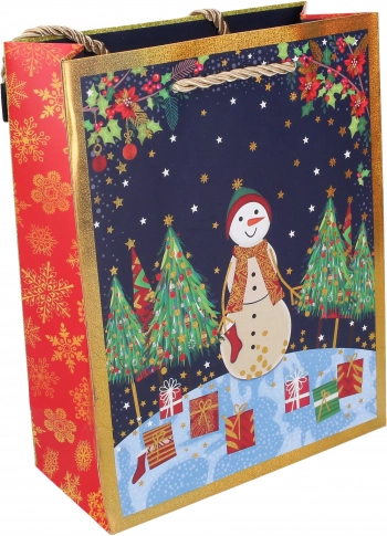 Stilfuld julegavepose i størrelse L med målene 42 × 31 × 12 cm, ideel til indpakning af større gaver. Tilbydes i 4 festlige designs, robust udførelse og behageligt håndtag for nem transport.