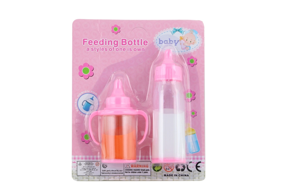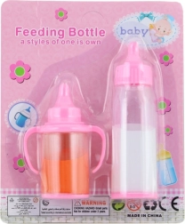 Sæt flasker med mad til dukke. Materiale plast. Indeholder væsker. Pakket på karton. Mål 17×14×3,5 cm. Alder 3+