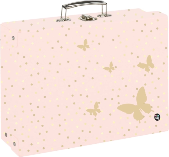 Børnevandtæt lamineret kuffert OXY GO med sommerfuglemotiv er ideel til opbevaring af skoleredskaber eller kreative materialer. Det passer til formatet A4 og er nemt at transportere takket være det praktiske håndtag.