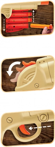 - Op-spænding af hanen bagpå flytter magasinet; affyring ved tryk på aftrækkeren