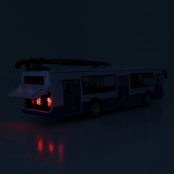 Betjeningen er enkel og underholdende: dørene åbnes manuelt, lukkes ved at trykke på knappen på taget, og se hvordan forlygterne blinker under lukningen. Trolleybussen kører med friktionsmotor, så den let suser hen over gulvet. LR44/AG13-batterier er inkluderet i pakken, så I kan komme i gang med det samme efter udpakning.
