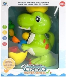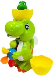 Den grønne dinosaur har også sin lille ven, som dit barn kan lege med i vandet. Den farverige vandmølle sikrer underholdning ved hvert bad. Fyld vand i og hæld det derefter i den halve skal på dinosaurens hoved. Vandet vil løbe ud gennem dinosaurens mund og derefter ned over de farvede tromler og sætte dem i bevægelse.