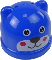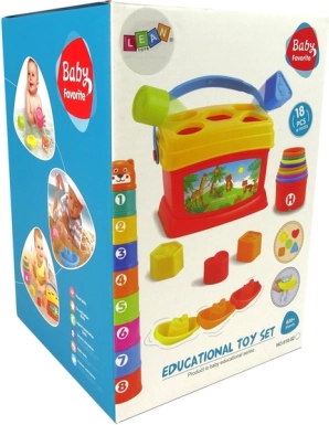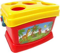 Spanden med låg fungerer som en formesorterer med dyremotiver, hvilket muliggør interaktiv leg og genkendelse af former og farver.