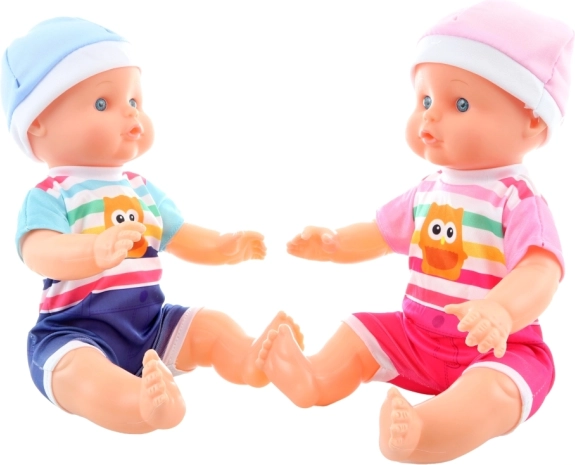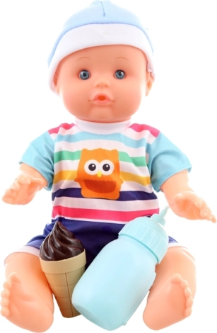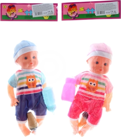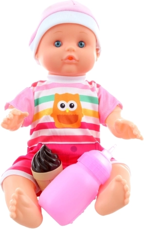 Sød babydukke i størrelsen 30 cm i farverigt tøj med en ugle, som vil glæde enhver lille omsorgsperson. Takket være funktionen drikker og tisser, de bøjelige lemmer og muligheden for at sætte dukken i siddende position tilbyder den realistisk rolleleg. Pakken indeholder tilbehør – flaske og is. Fås i 2 varianter (leveres efter lagerstatus). Velegnet fra 3 år.