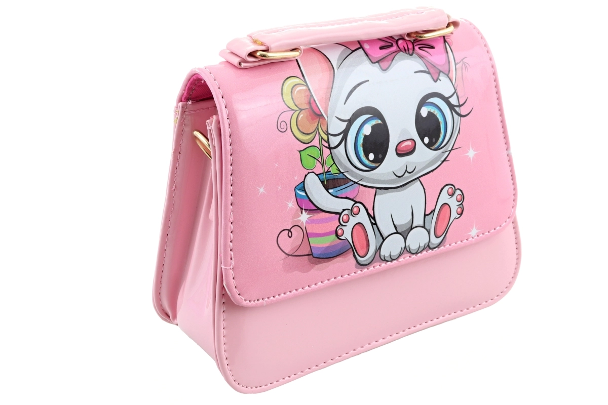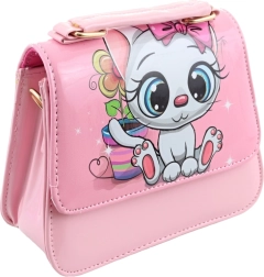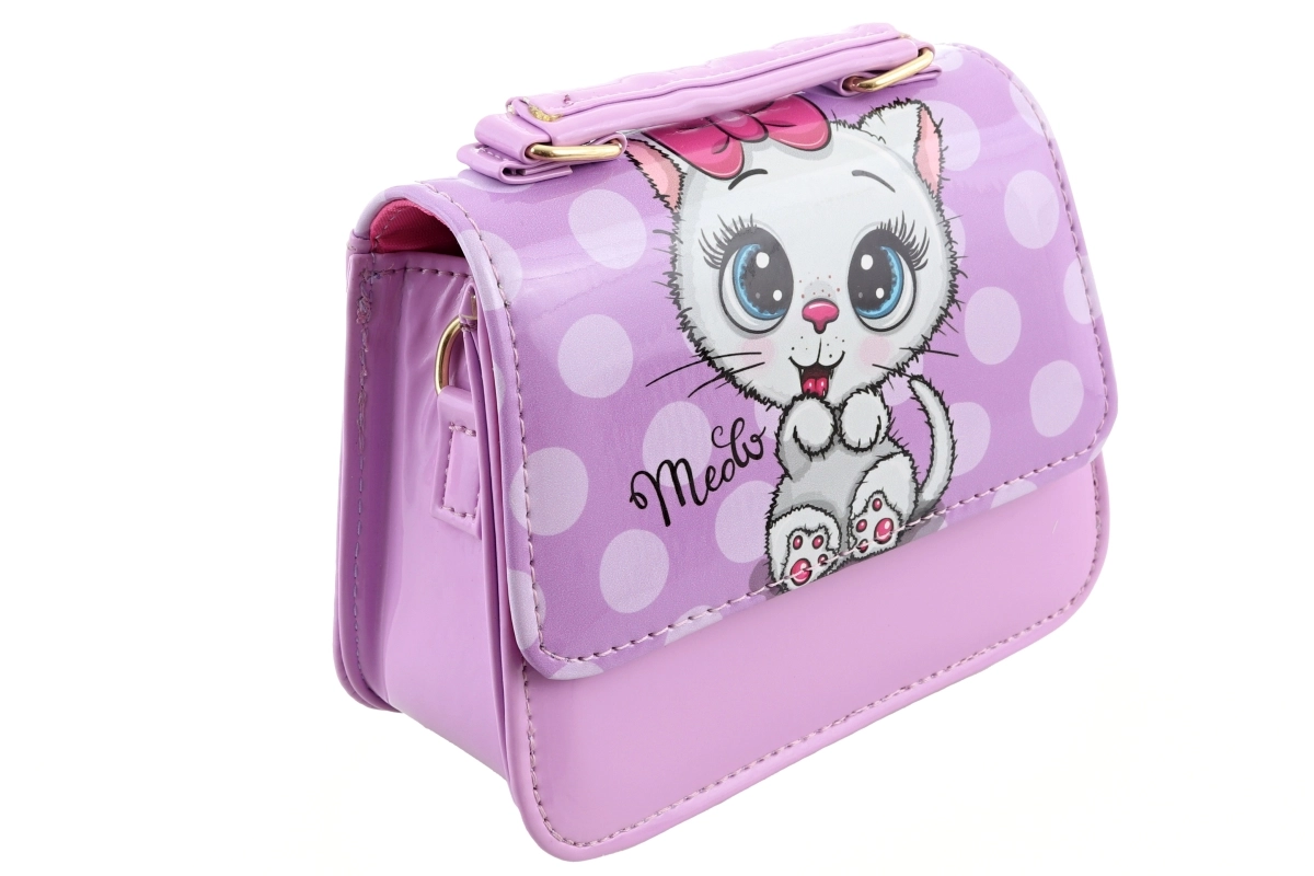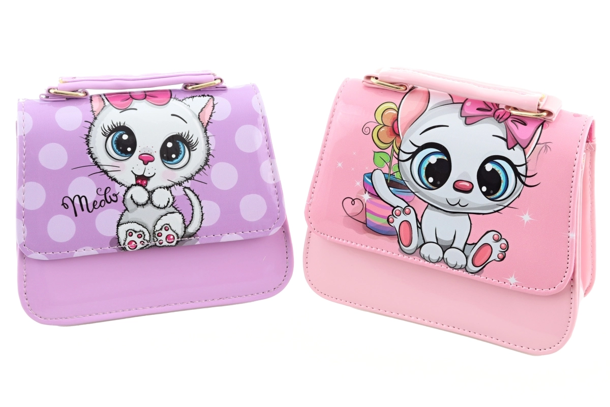 Farverig håndtaske med kattemotiv. Indeni 1 stor lomme. Mål 16x15x6 cm. Pakket i pose. 2 varianter – leveres efter lagerstatus. Alder 3+