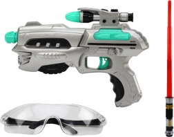 Dette kosmiske sæt forvandler enhver børnemission til en uforglemmelig oplevelse. Den futuristiske pistol med lys- og lydeffekter trækker børnene ind i “rumslag”, mens det røde lyssværd med en længde på op til 80 cm lyser ethvert eventyr op. Beskyttelsesbrillerne fuldender udstyret og giver følelsen af en ægte rumkriger.