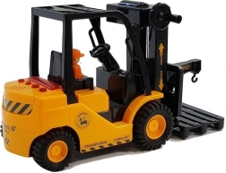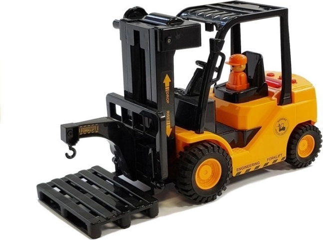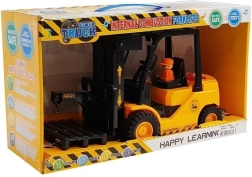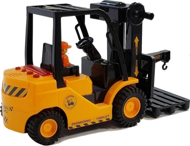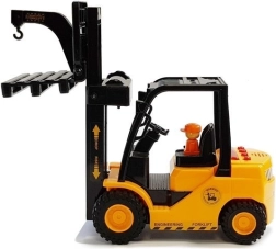 Realistisk børne-gaffeltruck i orange med bevægelige gafler, praktisk krog til last og interaktive lys- og lydeffekter. Takket være gummihjul er kørslen jævn og stabil, hvilket understøtter motorisk udvikling og kreativ leg.