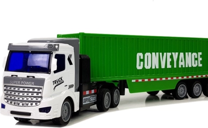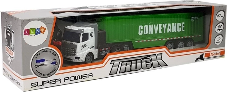 Denne fjernstyrede lastbil efterligner trofast et rigtigt vejgående køretøj – hvid kabine, grøn trailer og typiske detaljer fanger øjet med det samme. Nem styring med to joysticks muliggør kørsel frem/tilbage og drejning højre/venstre, og ved kørsel frem lyser blå LED-dioder kabinen op.