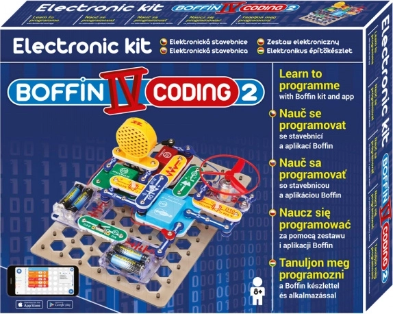 Det elektroniske byggesæt Boffin IV Coding er det ideelle valg for både børn og voksne, der vil lære elektronik fra bunden og samtidig lære at programmere. Delene klikkes nemt på pladen, så du på kort tid kan bygge fungerende projekter – fra lyseffekter og lydkredsløb til en flyvende propel og en ventilator. Ved at pare via modul U33 med den gratis Boffin‑app (Google Play / App Store) kan du styre og programmere projekterne på tjekkisk.
