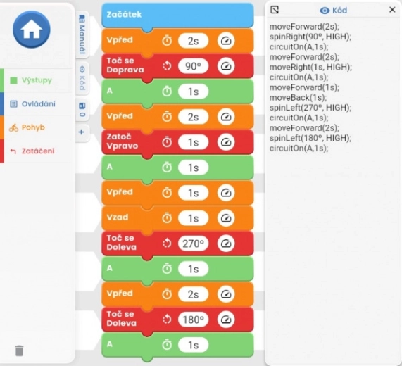 Par byggesættet via modul U33 med Boffin‑appen på tjekkisk, og indstil projektets adfærd i sektionerne Outputs, Styring, Bevægelse og Drejning. Skab effekter, automatiseringer og spilsituationer.