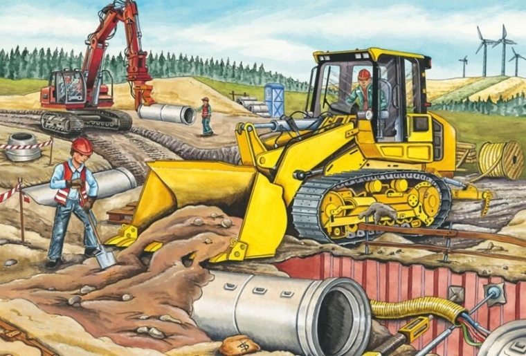 Sjovt sæt med tre puslespil med motiver fra en travl byggeplads fra mærket SCHMIDT. Hvert puslespil har 48 brikker og måler samlet ca. 26,3 × 17,8 cm – ideelt til børn, der elsker byggemaskiner og kvalitets-puslespil.