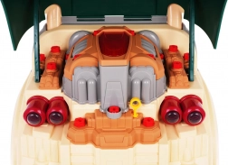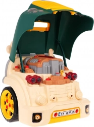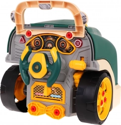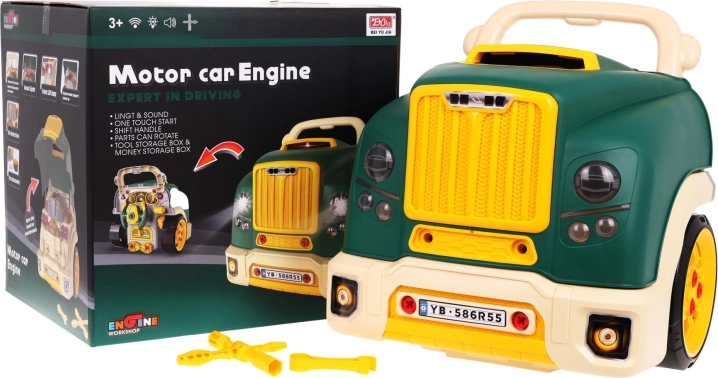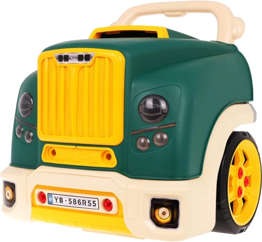 Denne grønne front af en lastbil med vipbar motorhjelm tilbyder masser af interaktiv underholdning: en motor, der kan skilles ad, lysende forlygter og autentiske lyde for start, kørsel og bakning. På instrumentbrættet finder du en startknap, rat med horn, advarselssignal og gearstang. Under rattet er der et praktisk opbevaringsrum til værktøj og skruer, og der er også et behageligt håndtag til nem transport.