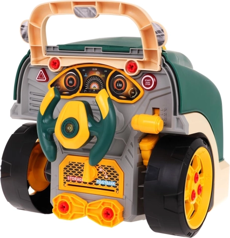 Interaktivt sæt til små mekanikere formet som fronten af en lastbil, der giver realistisk leg med lys, lyde og en motor, der kan skilles ad. Børn træner deres finmotorik, hånd-øje-koordination og lærer grundlæggende “reparationer” ved hjælp af skruer, værktøj og et funktionelt instrumentbræt med horn og motorstart.