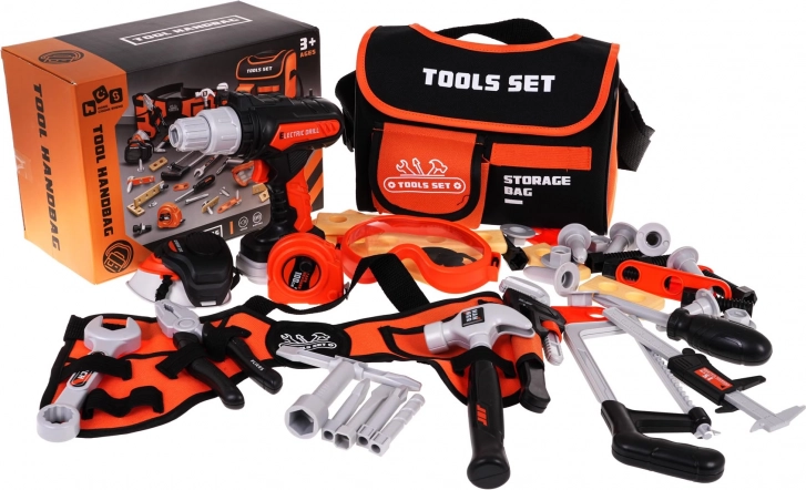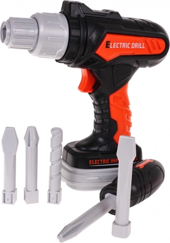 Dette veludstyrede værktøjssæt giver børn realistiske arbejdsoplevelser. Den sort‑orange plastboremaskine har udskiftelige bits, to rotationsretninger til at spænde og løsne samt et aftageligt “batteri” for endnu mere troværdig leg. Strømforsyning: 2× AA 1,5 V (medfølger ikke).
