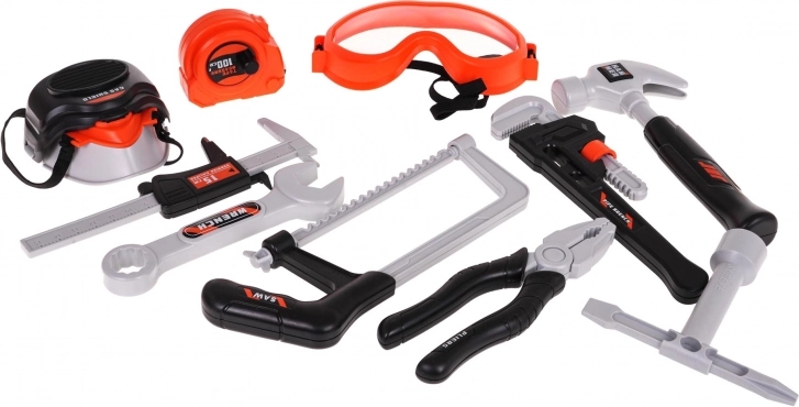 Hammer, tang, sav, nøgler, skruetrækker med bits, vinkel, målebånd, skruer, møtrikker, rawlplugs, forbindelsesdele og beskyttelsesbriller – alt til kreativ byggeleg.