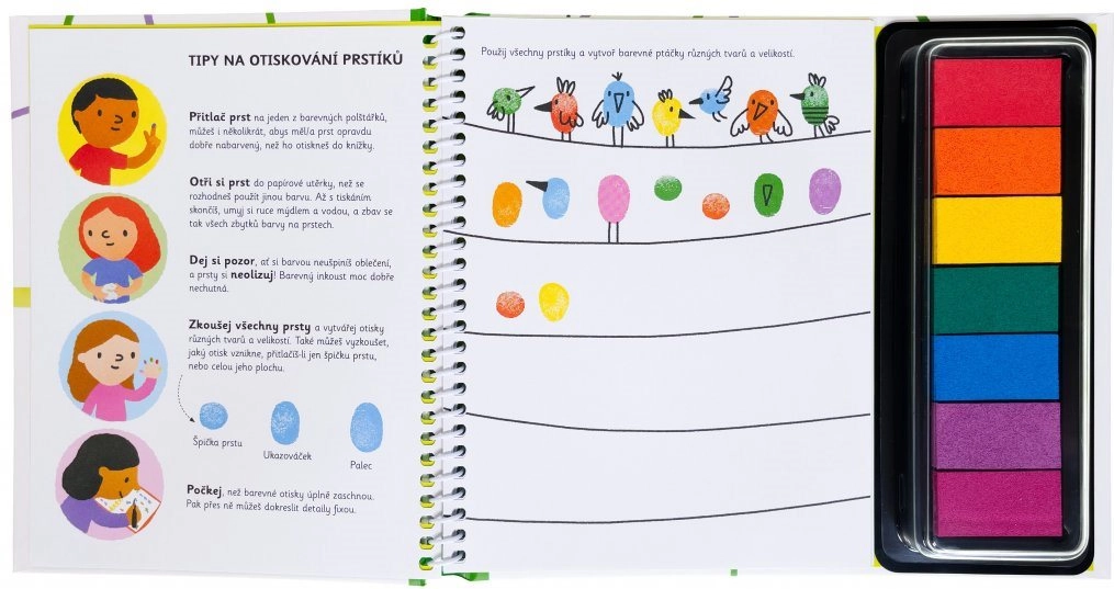 Dyk sammen med børnene ned i farver og kreativitet med bogen Sæt fingeraftryk - Aktiviteter med dyr. Det er nok at løfte låget på de farvede blækpuder og gå i gang med at stemple. Bogen opfordrer børn til at prøve forskellige fingre og skabe aftryk i forskellige former og størrelser. De kreative elementer i bogen gør det muligt for børnene at tegne egne detaljer til aftrykkene.
