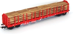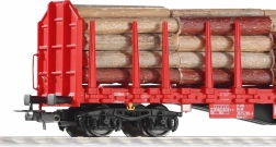Attraktiv model af en fireakslet fladvogn Roos‑t med stolper og last af træstammer i udførelse for de Tyske Jernbaner. Vogne af denne type bruges også til transport af andre halvfabrikata af træ eller endda stål. Den realistisk udførte last kan tages af, og placeringen af stolper kan også justeres. I pakken medfølger desuden flere ekstra stolper. Takket være den gennemarbejdede støbning, den kvalitetsmæssigt kontrastfulde lakering og skarp påtryk kommer detaljerne i konstruktionen og betjeningsudstyret flot til deres ret. Vognens gulv gengiver troværdigt den riflede overflade, og enderne prydes yderligere af eftermonterede håndlister og trin. For større variation i togstammer med producentens tidligere udgivne modeller af denne type er vognens betegnelse ændret. Det præcist designede og sammensatte chassis er en garanti for førsteklasses køreegenskaber. Hovedegenskaber: fire aksler realistisk udført last, aftagelige stolper NEM 362-skakt med kortkoblingskinematik